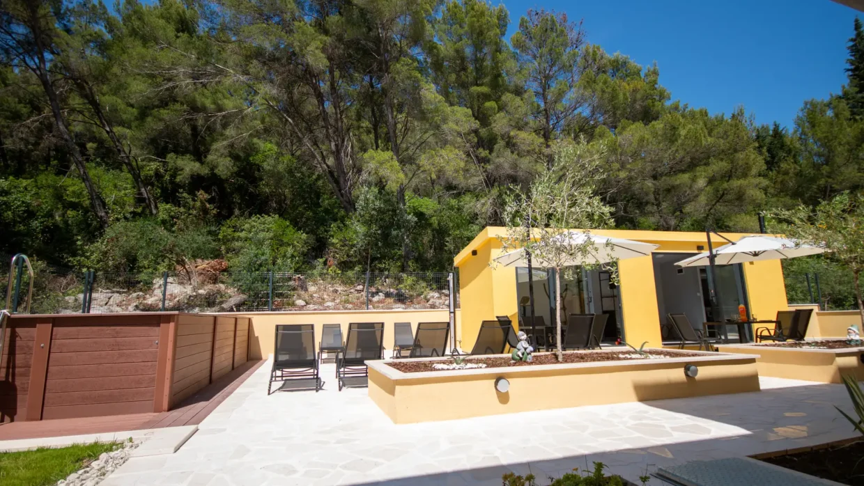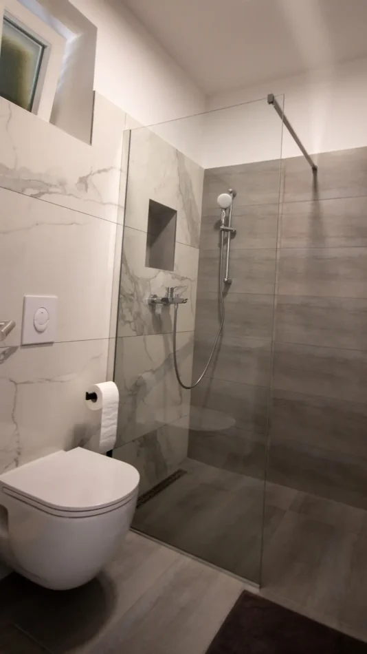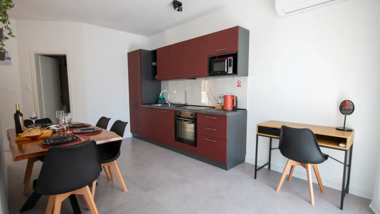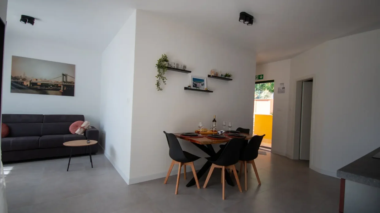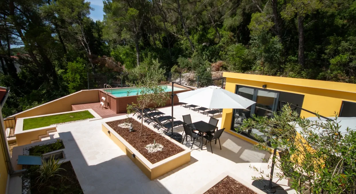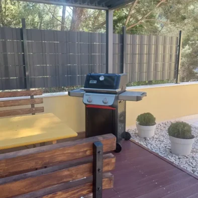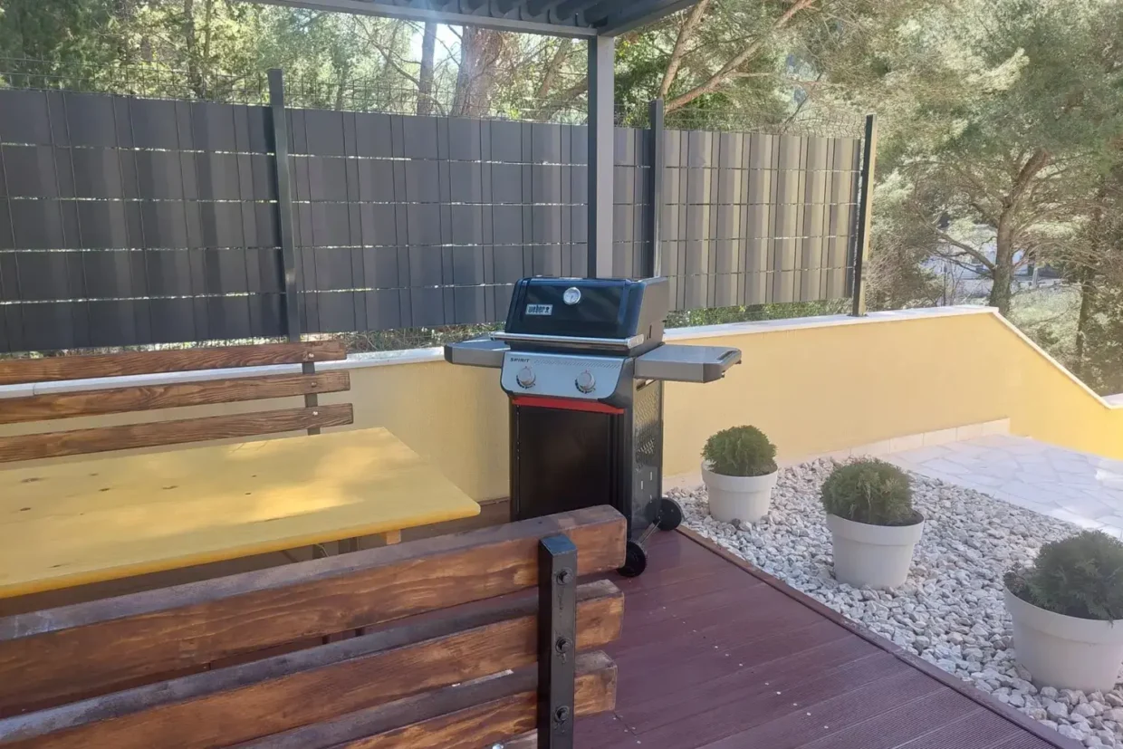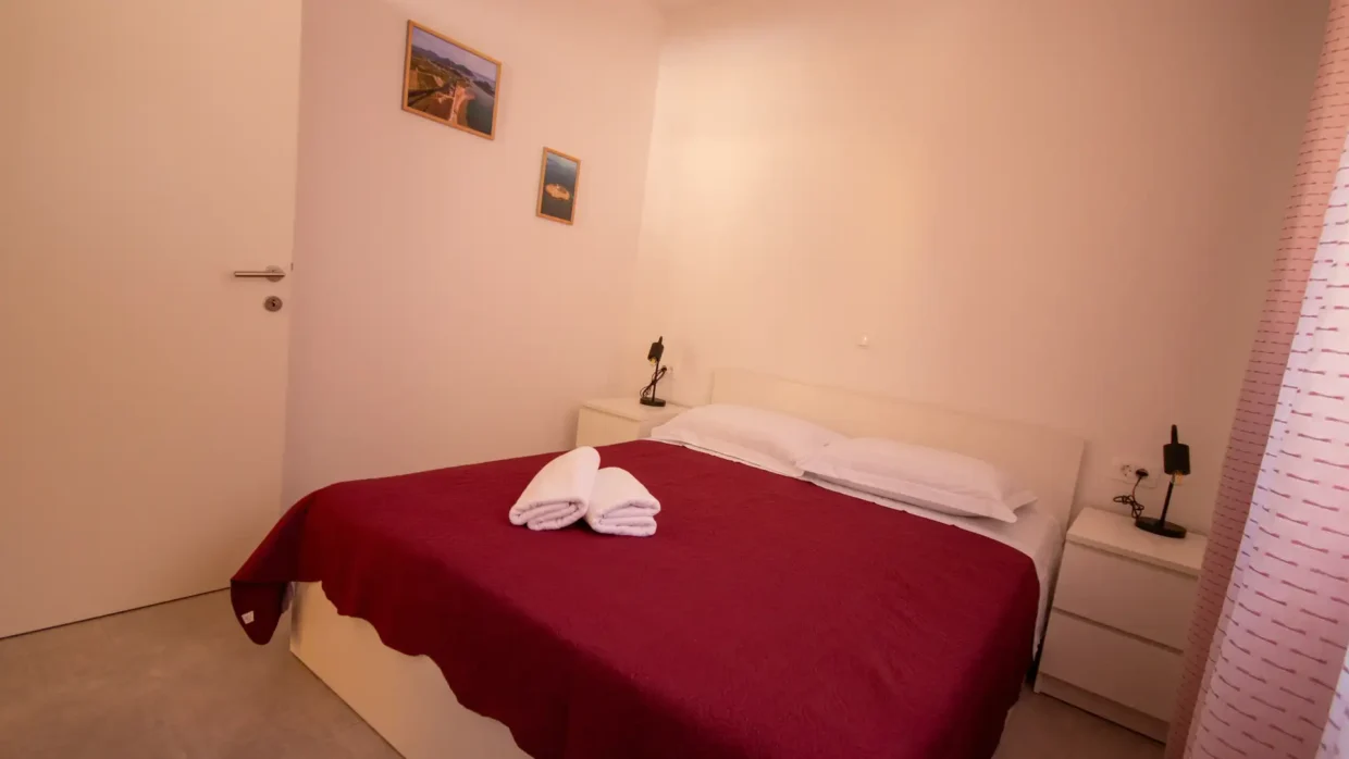 The apartment has a private entrance and is fully air-conditioned, ensuring a comfortable stay at any time of the year. It features a spacious living room with a pull-out sofa, a separate bedroom and a modern bathroom with a walk-in shower and a hairdryer. The accommodation is suitable for up to four people and its functional layout and contemporary furnishings provide a true home-away-from-home feeling, even for longer stays. Guests have access to a fully equipped kitchen with a stovetop, refrigerator, dishwasher and all necessary kitchenware. For added enjoyment, there is also a barbecue available, perfect for preparing meals outdoors - ideal for summer evenings with family or friends. A special highlight is the spacious terrace with stunning views of the sea and garden - perfect for morning coffee or evening relaxation while watching the sunset. The apartment is soundproofed, offering peace and privacy even during the height of the tourist season. It is also equipped with a flat-screen Smart TV with access to streaming platforms such as Netflix, as well as fast and stable internet, making it an excellent option for remote work. One of the standout features of this accommodation is the private pool located just in front of the apartment. Guests can cool off at any time of day, relax on sun loungers or simply enjoy the tranquil surroundings away from the crowds. If you're looking for accommodation in Blace with a pool, sea view, and modern amenities, our apartment is the perfect choice. We offer quality, privacy and an authentic Adriatic experience – all in one place.