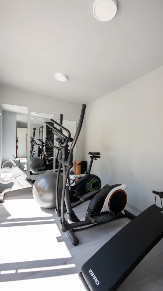 Within the social area, you can also find a mini fitness center equipped with exercise equipment such as dumbbells, stationary bikes, rowing machines, treadmills and more.